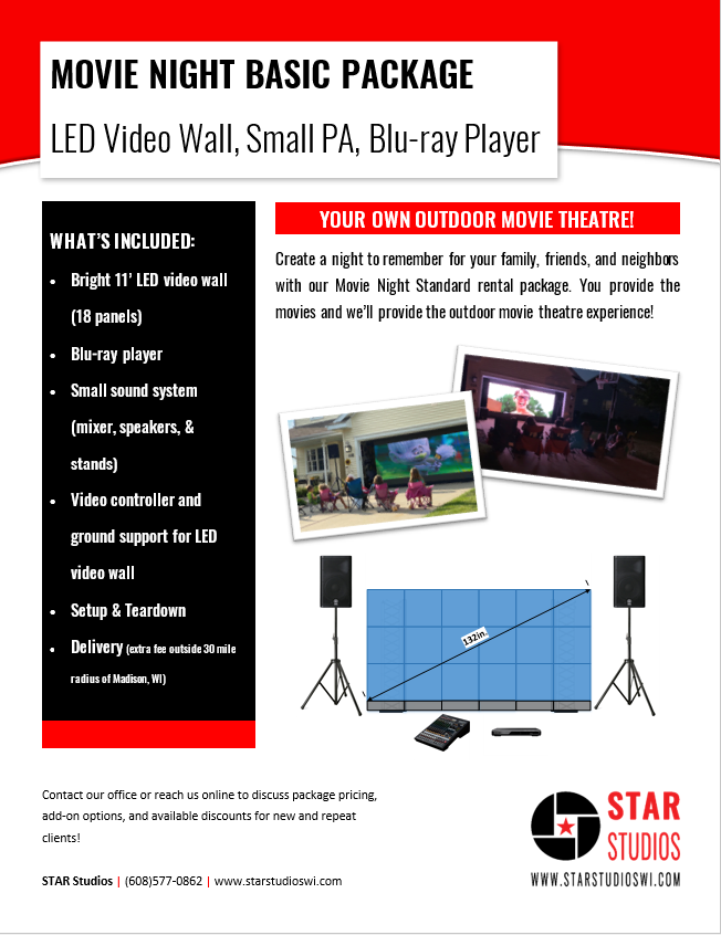 11' diagonal outdoor LED video wall (3.9mm pixel) rental package (18 panels total), small sound system with speaker stands and mixer, blu-ray/DVD player. Daily rental price. Includes delivery (within 30 mile radius of Madison, WI), setup, and teardown.