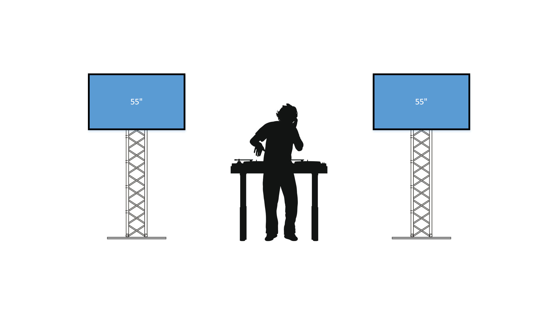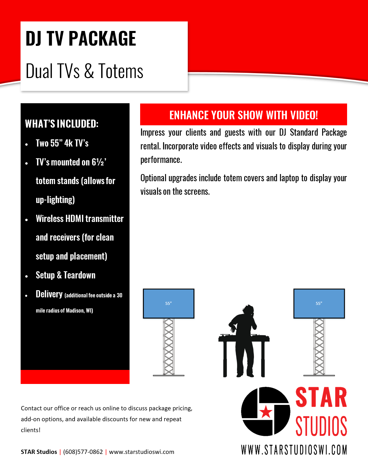 Impress your clients and guests with our DJ Standard Package rental. Incorporate video effects and visuals to display during your performance. Optional upgrades include totem covers and laptop to display your visuals on the screens. Package includes two (2) 55" 4K TVs each mounted on 6.5' totem truss stands, wireless HDMI transmitter and dual receivers for clean setup and placement, delivery (additional fees outside of a 30 mile radius of Madison, WI), setup, and teardown. Prices are for a single daily rental. Multi-day rental discounts available.